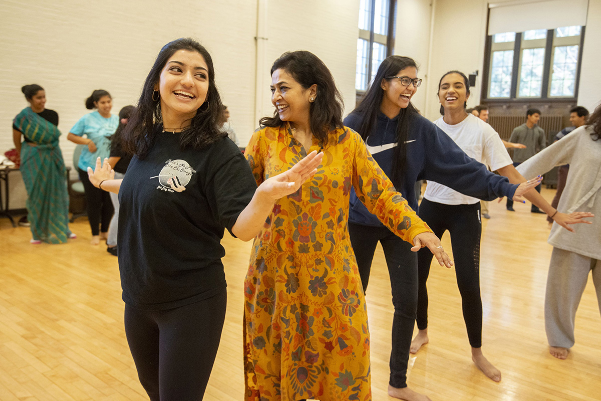 From left: Nikita Joshi, Anamika Kumari, Rachana Reddy and Megha Panigrahi practice traditional Bollywood dance steps during a workshop Nov. 16 led by choreographer Lily Sugathan. Madhavi Verma, lecturer in Arts & Sciences, coordinated the event. (Photo: Danny Reise/Washington University)