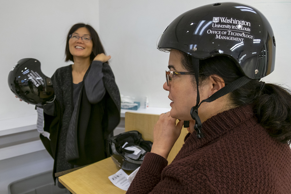 Nov. 14 gave away 25 WashU/OTM-branded helmets. (Photo: Sid Hastings/Washington University)