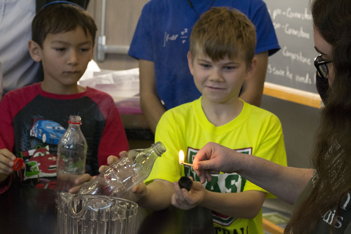 Physics student Julia Cohen (right) demonstrates to middle school students the second part of how to create a cloud in a bottle at the annual Physics Family Fun Day Nov. 17. The annual event demonstrates the role that physics plays in everyday life. (Photo courtesy of the Physics Outreach Committee)