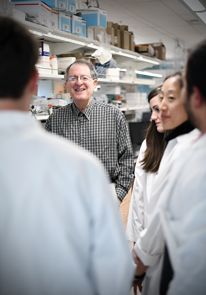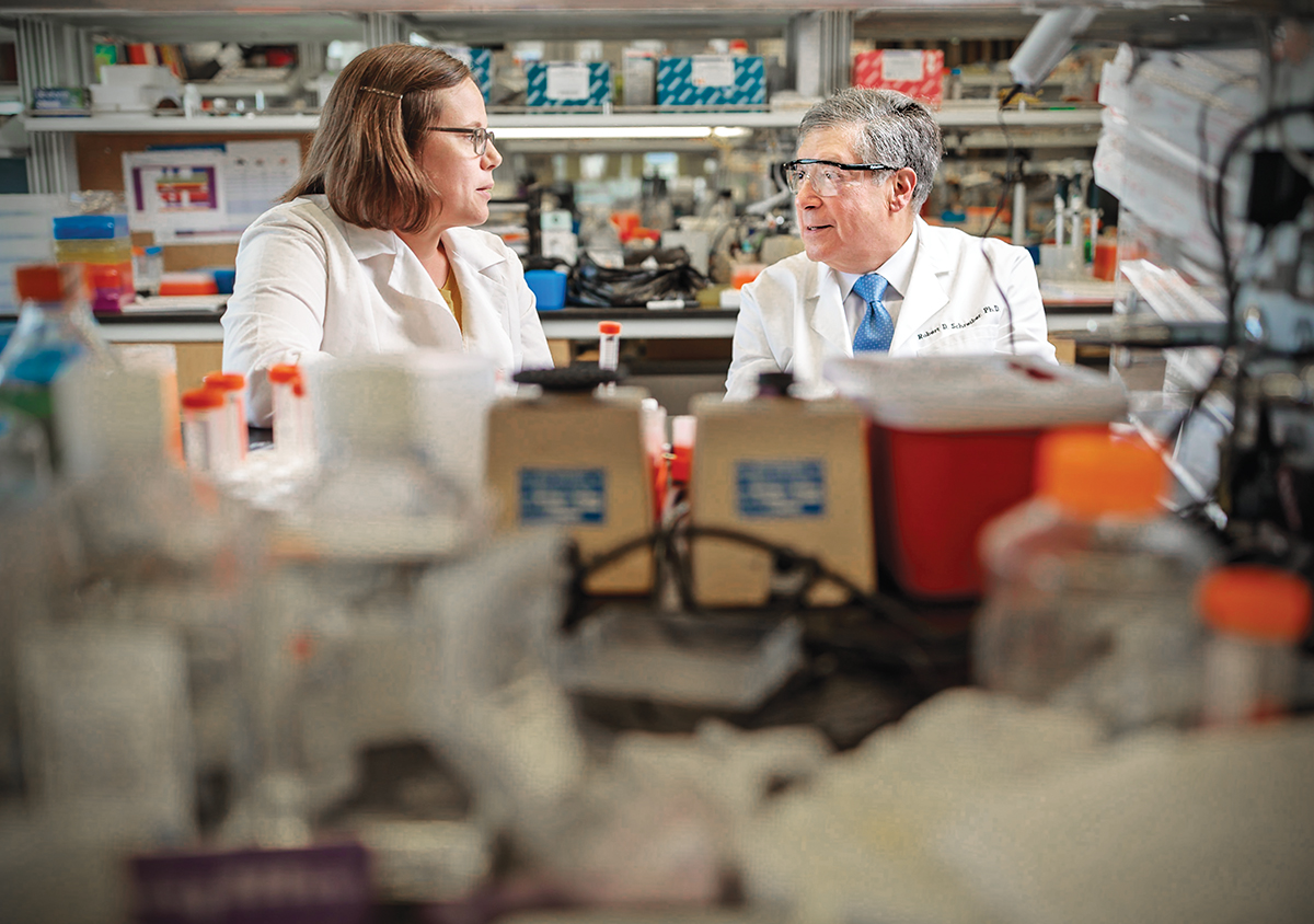 Robert D. Schreiber, PhD, the Andrew M. and Jane M. Bursky Distinguished Professor and professor of molecular microbiology, is director of the Andrew M. and Jane M. Bursky Center for Human Immunology and Immunotherapy Programs, where basic, translational and clinical aspects of human immunology and immunotherapy research are seamlessly integrated. Key areas of research include infectious disease and vaccines, immune dysfunction, and the immune system’s role in cancer. He and center collab-orators have pioneered the use of genomic approaches in major translational programs that test the therapeutic efficacy of personalized vaccines in patients with cancers of the breast, brain, lung, pancreas, prostate, skin and lympathic system. Here, Schreiber works with postdoctoral research fellow Elise J.O. Alspach, PhD, at the BJC Institute of Health. Photo by Matt Miller