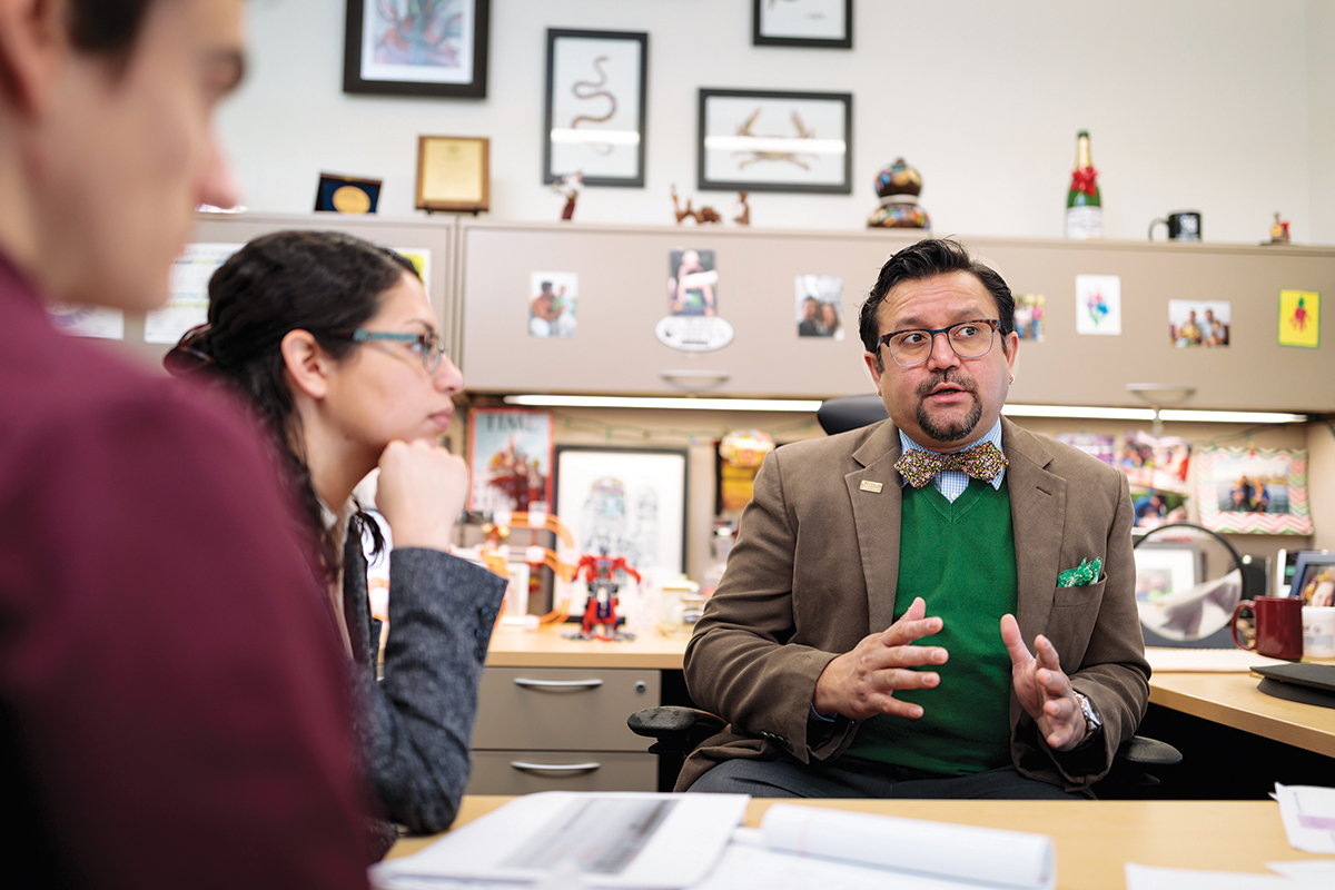 Gautam Dantas, PhD (right), professor of pathology and immunology, of biomedical engineering, and of molecular microbiology at the medical school, is recognized for his outstanding contributions to graduate student teaching and mentoring. Dantas leads an interdisciplinary team of basic scientists, engineers and clinicians focused on understanding antibiotic resistance, designing novel antibiotic and probiotic therapies, and engineering microbial catalysts. Their work has been published in top journals and yielded many patents. Dantas is co-director of the Division of Biology and Biomedical Sciences’ Computational and Systems Biology graduate program. Over the past nine years, he has mentored 10 postdocs, 20 graduate students, five research technicians, and more than 50 high school and undergraduate interns in his laboratory. Photo by Matt Miller