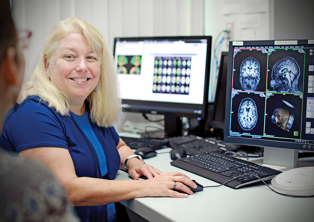 Deanna M. Barch, PhD, the Gregory B. Couch Professor of Psychiatry and chair of the Department of Psychological & Brain Sciences, is a leading researcher on the role of cognition, emotion and brain function in illnesses such as depression and schizophrenia. She uses functional MRI, structural MRI and cognitive neuroscience methods to examine the neural basis of risk for the development of these illnesses, potentially as a means of developing better preventive approaches. Her work includes a focus on the ways in which early adversities (stress, poverty and disparities in access to health care) shape early brain development and subsequent risk for mental-health challenges. Here, Barch confers with Joan Luby, MD (at left), the Samuel and Mae S. Ludwig Professor of Child Psychiatry and director of the Early Emotional Development Program. Photo by James Byard