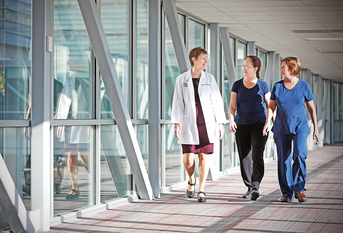 Laura J. Bierut, MD ’87, HS ’91, the Alumni Endowed Professor of Psychiatry, is a physician-scientist with expertise in genetic studies of smoking behaviors, addiction, and other psychiatric and medical illnesses. She is an active member in the National Institute on Drug Abuse Genetics Consortium, a group of scientists leading efforts to understand genetic causes of substance-use disorders. She has led large, collaborative projects through the National Institute on Alcohol Abuse and Alcoholism and the National Cancer Institute to discover genetic roots related to susceptibility to addiction. Through these projects, thousands of research participants from St. Louis have been interviewed and have given blood samples for genetic discovery. Now, she is working to translate this knowledge into action to reduce smoking and other addictions. At Barnes-Jewish Hospital, Bierut (left) is working with clinical nurse specialists, such as Ann Petlin (center) and Carrie Sona, to develop nursing-led smoking cessation programs for hospitalized patients.