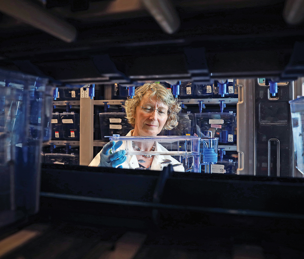 Lilianna (Lila) Solnica-Krezel, PhD, is the Alan A. and Edith L. Wolff Distinguished Professor, head of the Department of Developmental Biology, and co-director of the Center of Regenerative Medicine. In Washington University’s zebrafish facility, one of the largest and most modern facilities in the world, Solnica-Krezel and others conduct large-scale, collaborative projects that help scientists understand human development and disease, from birth defects and cancer to musculoskeletal and nerve disorders. A common type of minnow, the zebrafish is popular in both scientific research and home aquariums. Zebrafish embryos are transparent and develop outside the mother’s body, making them useful for observing growth and development. Photo by James Byard