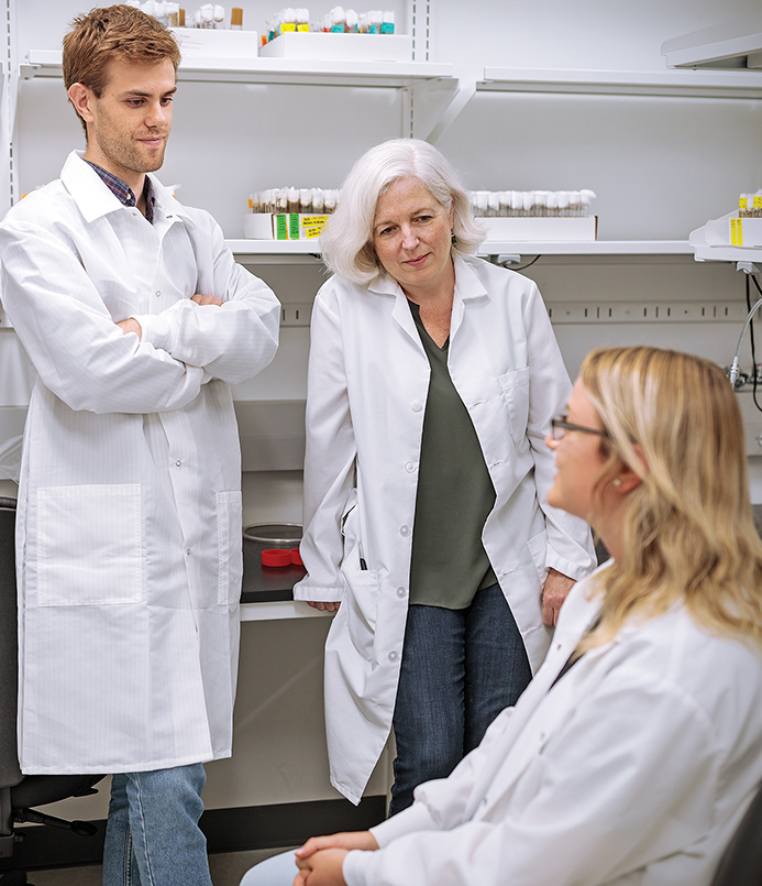 Helen McNeill, PhD (center), professor of developmental biology, was recently named the inaugural holder of the Larry J. and Carol A. Shapiro Professor at the School of Medicine. Here, McNeill works in her lab with Alex Fulford, PhD (left), a postdoctoral research associate, and Megan Glaeser, a research technician, to understand how tissue growth and tissue organization are coordinately regulated during normal development, and how loss of this control leads to human disease. McNeill, whose work in developmental biology spans birth defects to cancer, was also the first researcher named a BJC Investigator. The new BJC Investigators Program aims to recruit scientists who bring innovative approaches to major biological quandaries. Inspired by the Howard Hughes Medical Institute’s philosophy of investing in people with exceptional creative talent, the BJC Investigators Program plans to bring 10 renowned researchers to the medical school and the life sciences ecosystem of St. Louis. Photo by Matt Miller
