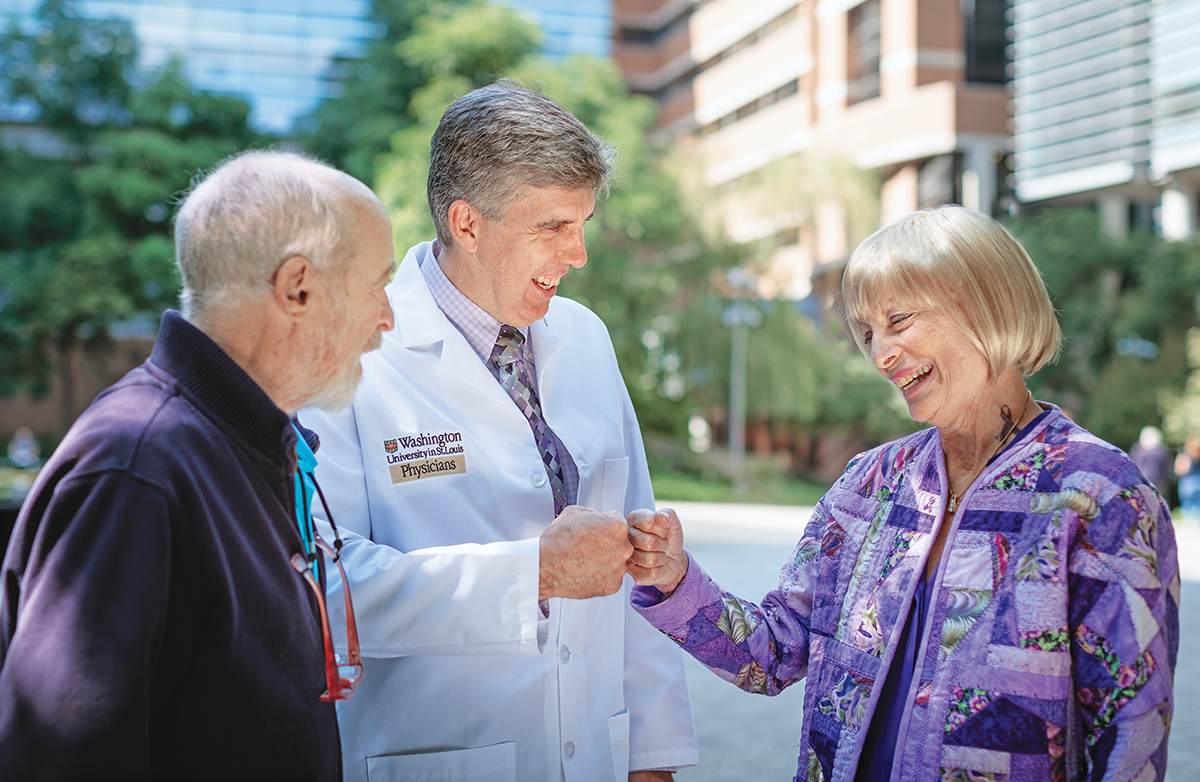 William G. Hawkins, MD, FACS (center), the Neidorff Family and Robert C. Packman Professor of Surgery, is chief of the Section of Hepatobiliary-Pancreatic and Gastrointestinal Surgery. A noted pancreatic cancer surgeon at Siteman Cancer Center, in 2016, he and other researchers and physicians at Siteman were awarded a five-year, $10.4 million National Cancer Institute grant to lead a national group of experts in collaborative pancreatic cancer research. The award, a prestigious Specialized Program of Research Excellence (SPORE) grant, will help scientists pursue new treatments for the deadliest form of the disease, pancreatic ductal adenocarcinoma, including development of more effective chemotherapies and a vaccine. Each year at the School of Medicine, Hawkins hosts a group of survivors of pancreatic cancer, such as Harry Stern and Edie Cornell-Smith, for a day of lectures and sessions on the latest developments in the field. Photo by Matt Miller