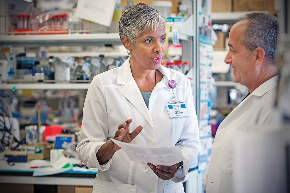 Sarah K. England, PhD, is the Alan A. and Edith L. Wolff Professor of Medicine and professor of cell biology and physiology. She is considered one of the premier authorities on the molecular mechanisms underlying uterine function during pregnancy. Specifically, her research focuses on understanding the role of ion channels in modulating uterine activity in women with pre-term labor, with the goal of developing better therapeutic targets. Here, she confers with staff scientist Ronald T. McCarthy in her lab in the BJC Institute of Health at Washington University School of Medicine. Photo by Matt Miller
