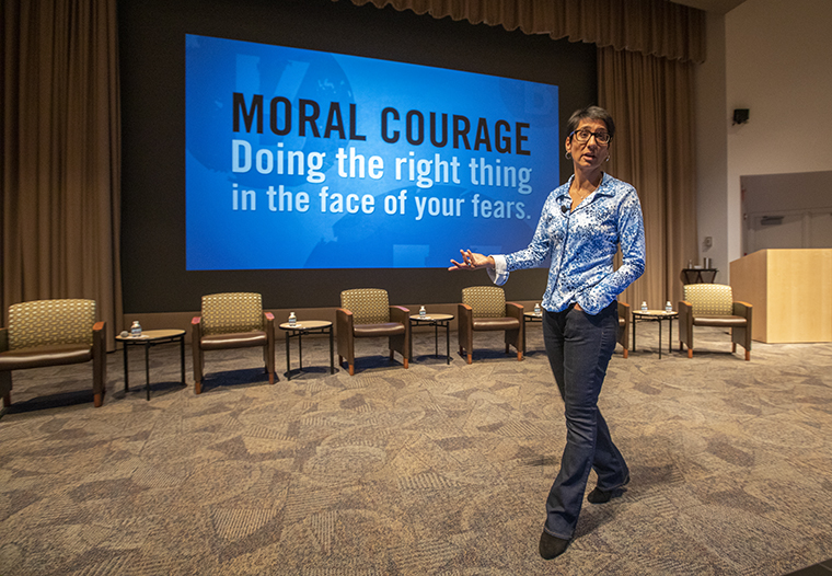 “Moral courage is not just about speaking truth to power,” Manji said from the Eric P. Newman Education Center on the Medical Campus. “Moral courage starts by speaking truth to our egos and by reminding ourselves that just as we are plural internally — many things at once — so is our ‘other’ many things at once.”