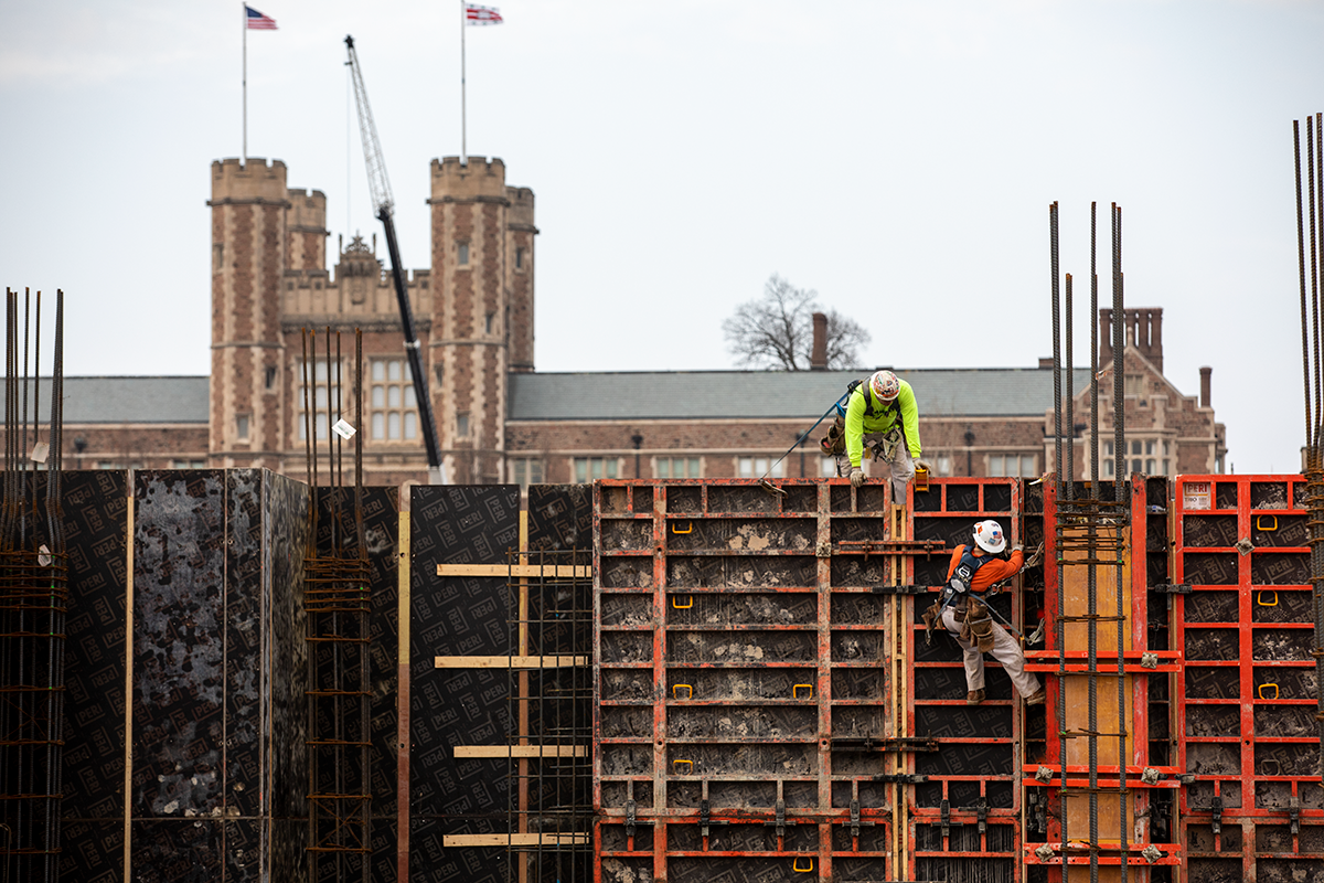 Construction continues at the east end site Feb 4. Windows on the west side of the bridge connecting Jubel (left) and Whitaker halls were being tested. (Photo: Joe Angeles/Washington University)