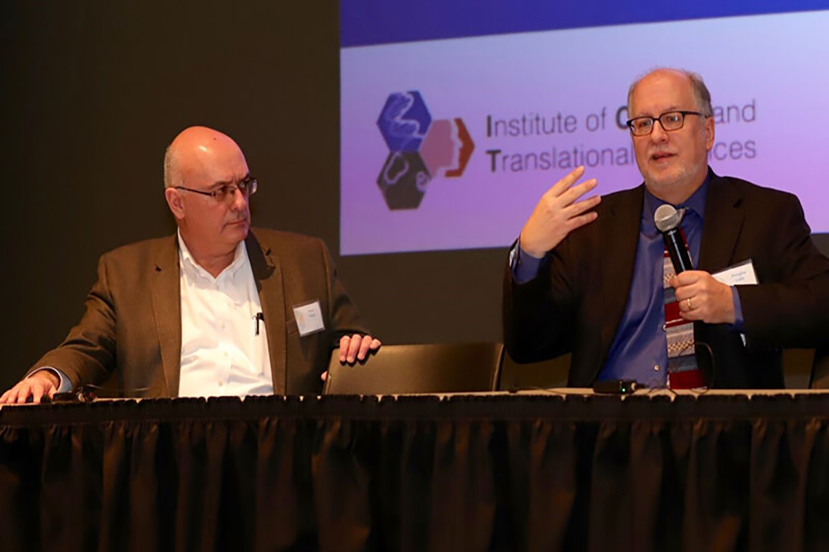 Emre Toker (left) of the Skandalaris Center and Doug Luke of the Brown School engage the audience during their presentations on “Innovation Challenges and Opportunities for Implementation Science and Entrepreneurship” at the ICTS conference, Jan 15, 2019.
