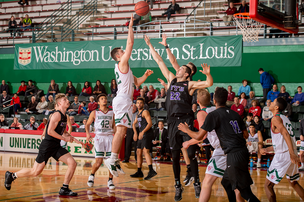 The WashU men’s basketball team plays against NYU on Feb 15. (Photo: Danny Reise/Washington University)
