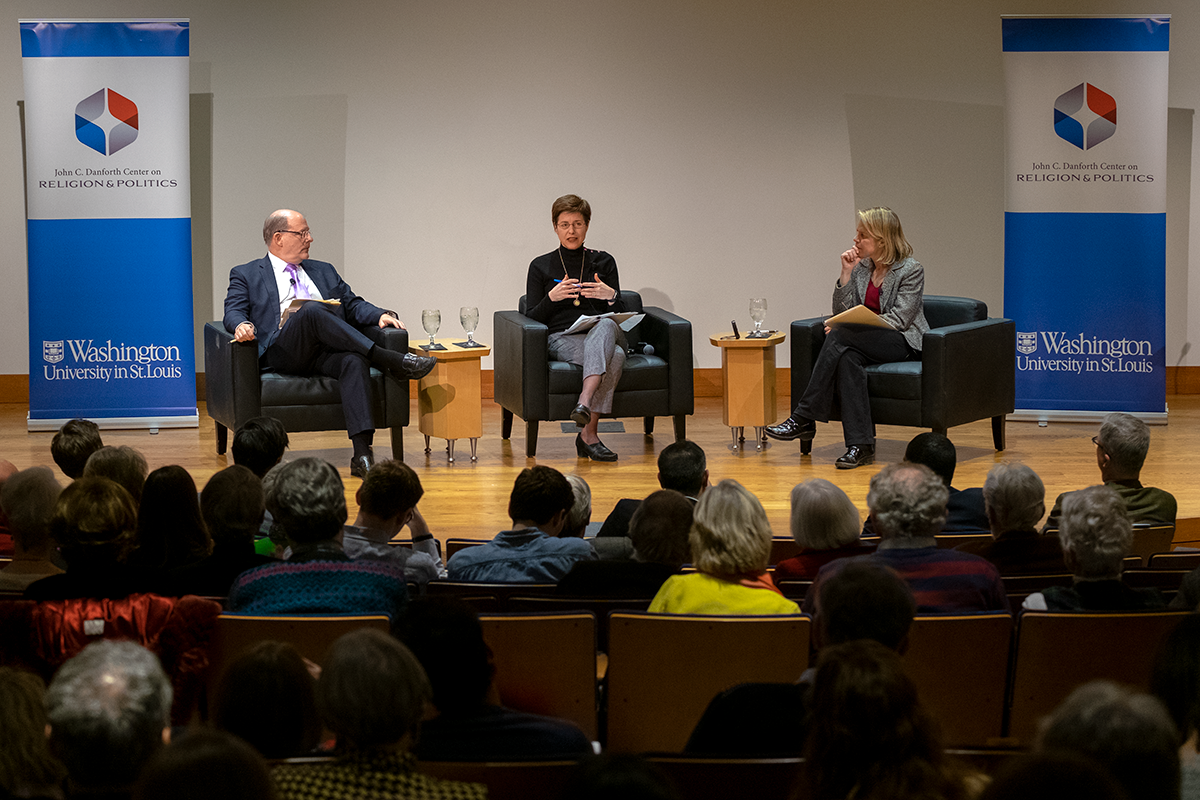Mellisa Rogers (center), of the Brookings Institute and Wake Forest University, and Peter Wehner, of the Ethics and Public Policy Center, took part in a discussion on “Revitalizing Democratic Pluralism,” sponsored by the John C. Danforth Center on Religion & Politics, Feb. 12. Marie Griffith, director of the Danforth Center, listens at right. (Photo: Sid Hastings/Washington University)