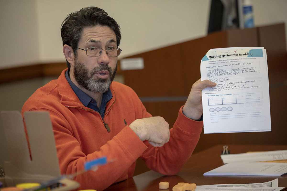 On this day, DeVoll is meeting with a group of advisees to engage in a design-thinking exercise about the upcoming summer. The students generate ideas for summer projects both big (jobs, internships, study abroad, course work) and small (network with alums in your prospective field, shadow a professional). Next, they analyze to what degree they have the resources, desire, confidence and capability to pursue these projects and who can help them get there. Want to return to your lifeguarding job at the neighborhood pool? Great, DeVoll said. But maybe you can deepen your skills on the job or gain additional experience by volunteering a few hours at a local nonprofit.