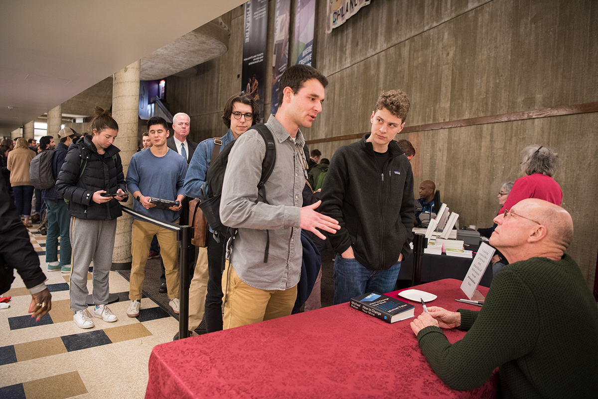 Popular author and food expert Michael Pollan visits with guests at a reception and book signing in the Mallinckrodt Center’s Schoenberg Gallery following his Assembly Series talk Feb. 21 in Graham Chapel. (Photo: Mary Butkus/Washington University)