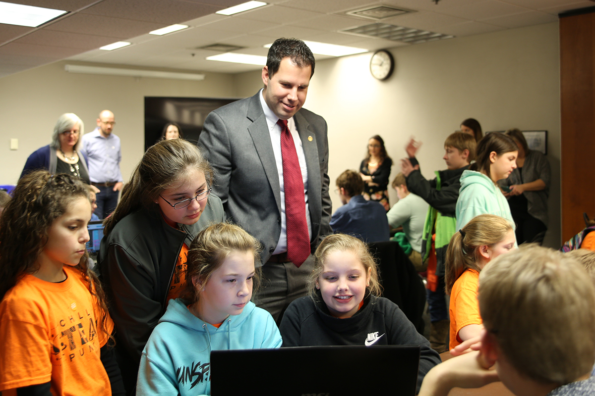 Students demonstrate their coding skills to State Rep. Aaron Griesheimer, R-Washington, during an “Hour of Code” event March 7 at STEM Day at the Capitol in Jefferson City. The university’s Institute for School Partnership hosted the event, in collaboration with Code.org, LaunchCode and Science City. (Photo: Myra Lopez)