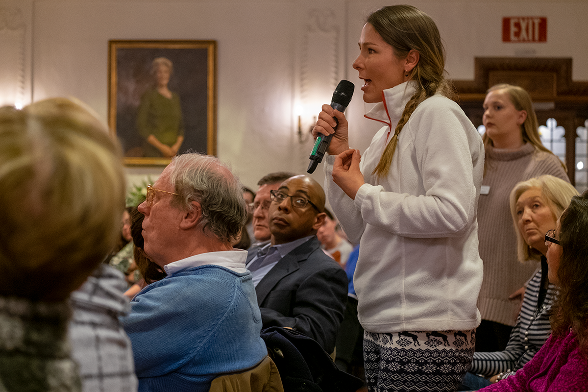 The John C. Danforth Center on Religion & Politics organized a panel discussion, “Welcoming the Stranger to St. Louis: Religious Responses to Recent Immigrants and Refugees,” Feb. 20 in the Women’s Building. Here, Rosalynde Welch participates in the question-and-answer session. (Photo: Sid Hastings/Washington University)