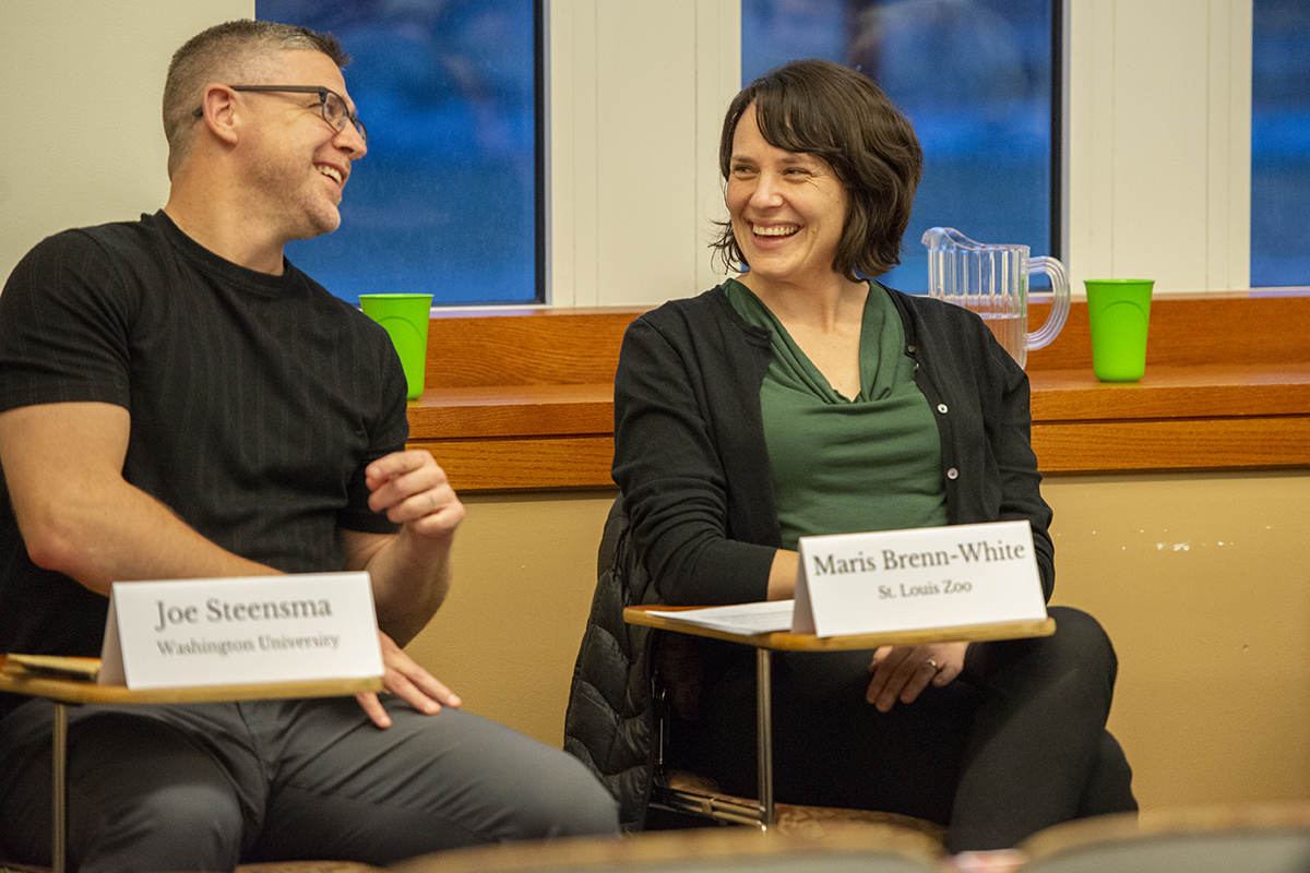 Joe Steensma, professor of practice at the Brown School, shares a laugh with Maris Brenn-White, of the St. Louis Zoo, during a panel discussion Feb. 28 on critical global health problems held as part of the student-led Global Health Week (Photo: Danny Reise/Washington University)