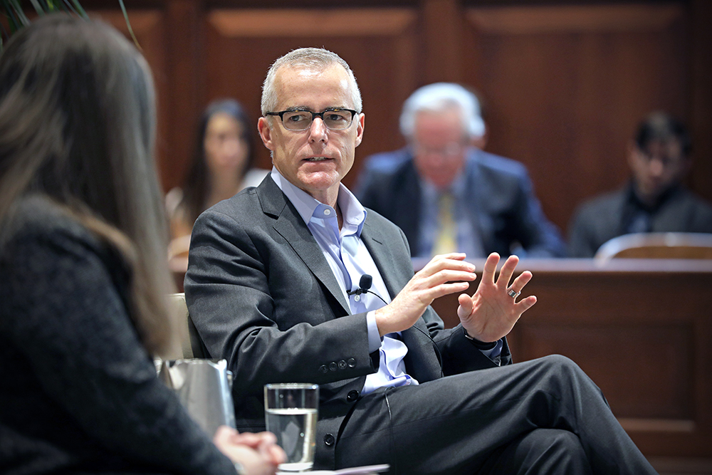 Andrew McCabe, a 1993 law alum, talks about working for the FBI during a March 7 chat with Rebecca Hollander-Blumoff, professor of law. “It was striking to live and work in the bureau in the pre-September 11th and the post-September 11th world. I think we knew, even that day, that nothing would ever be the same again.” McCabe served as the FBI’s deputy director from February 2016 to January 2018. (Photo: James Byard/Washington University)