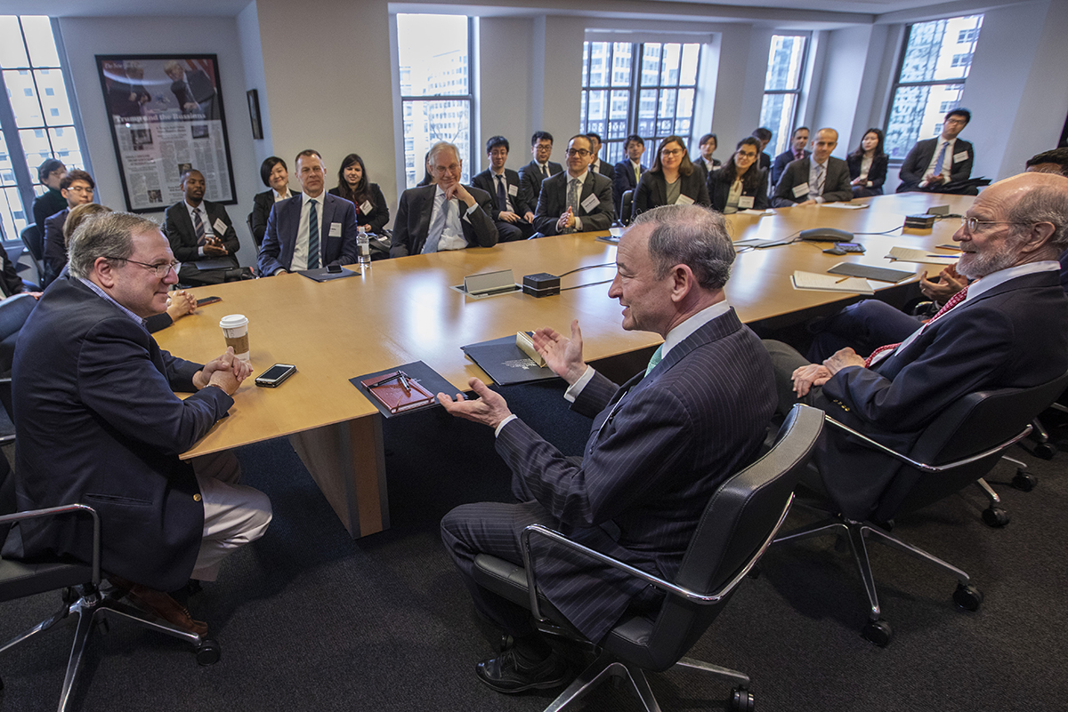 During a spring break visit to Washington, D.C., McDonnell International Scholars Academy members visited the New York Times bureau. David Sanger (left), national security correspondent for the Times, visits with Chancellor Mark S. Wrighton (center), university trustee John McDonnell and founding benefactors of the academy. (Photo: Joe Angeles/Washington University)