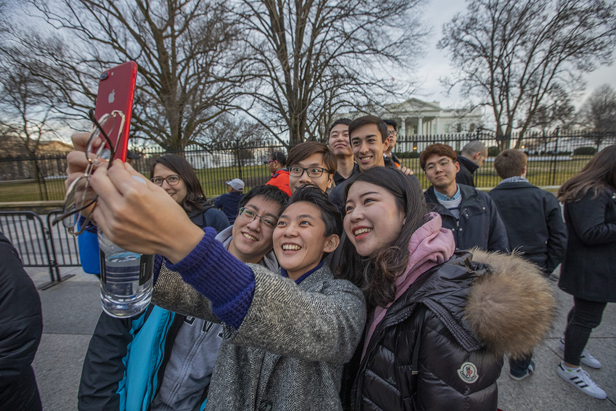 McDonnell International Scholars Academy members spent spring break in Washington, D.C. They took an evening monuments tour March 10 that included the White House. (Photo: Joe Angeles/Washington University)