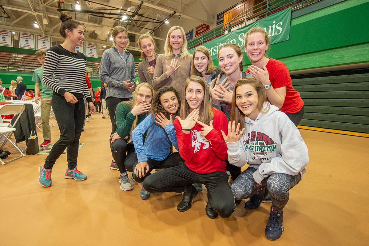 The WashU women’s team celebrates its cross-country national championship March 30 at the Field House. (Photo: Danny Reise/Washington University)