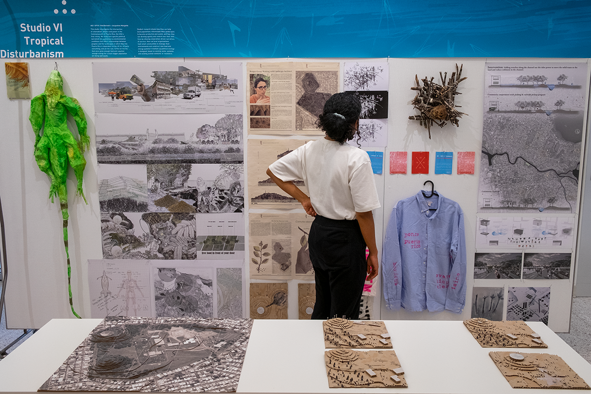 A visitor takes in an exhibit April 3 in the Steinberg Hall gallery featuring landscape architecture work from the Sam Fox School. (Photo: Sid Hastings/Washington University)