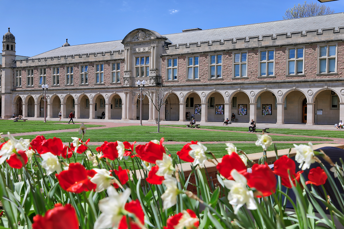 Flowers have erupted across the Danforth Campus, as seen April 9 in Brookings Quadrangle. (Photo: James Byard/Washington University)