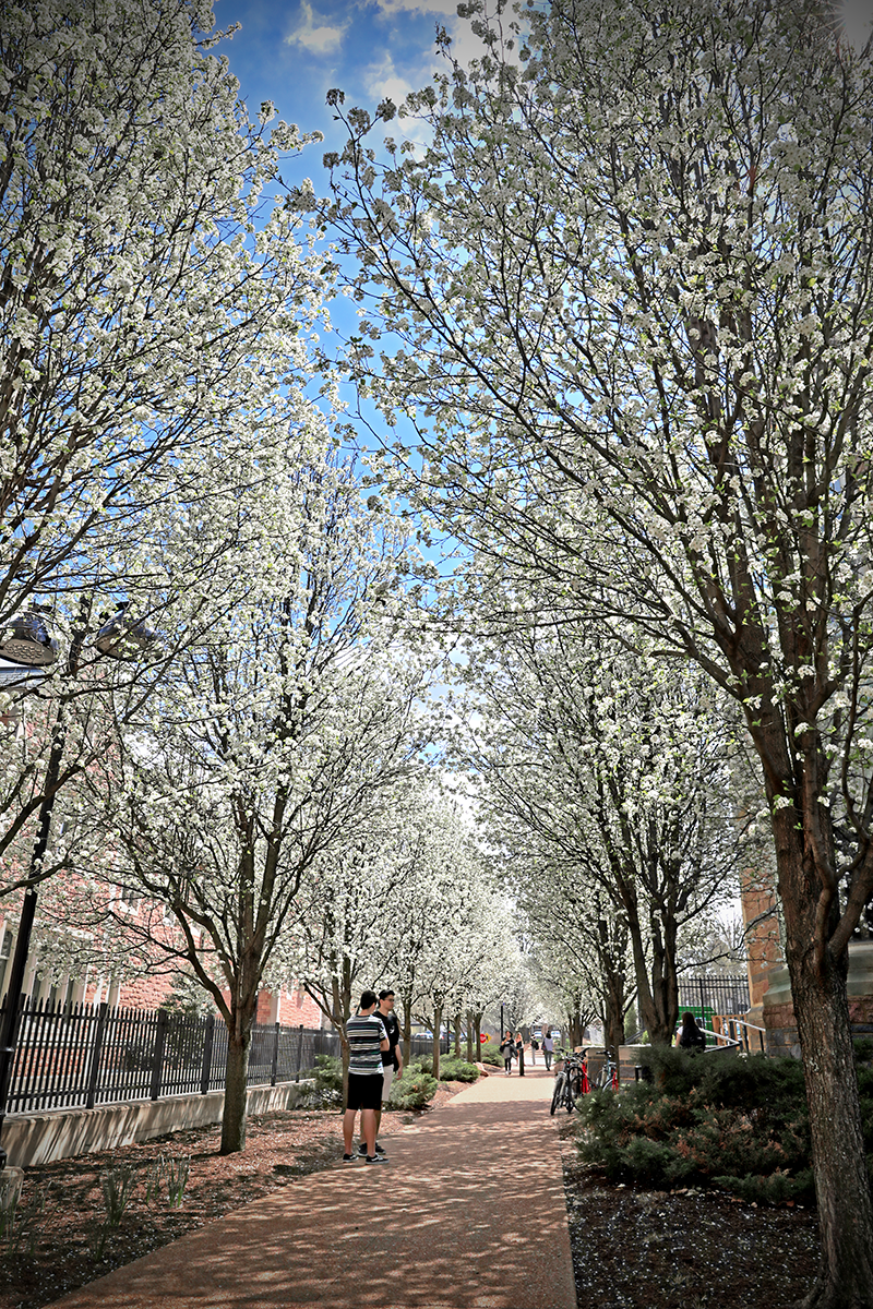 Students walk amid trees in bloom April 8 on the Danforth Campus. (Photo: James Byard/Washington University)