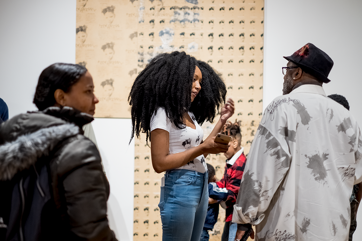 Visitors enjoy the Sam Fox School’s BFA Show on April 5 at the Des Lee Gallery in downtown St. Louis. (Photo: Whitney Curtis/Washington University)