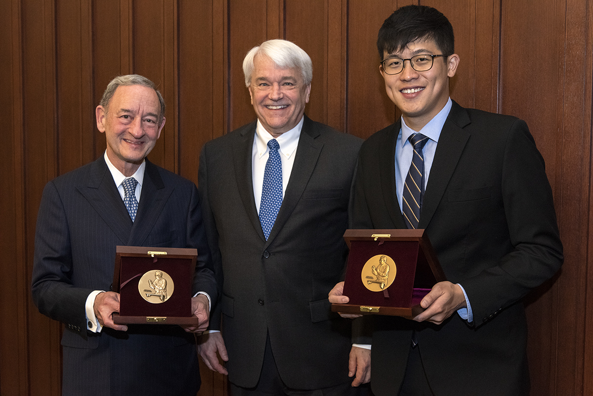 The university’s Weidenbaum Center on the Economy, Government, and Public Policy presented the 2019 Weidenbaum Center Award for Excellence to Chancellor Mark S. Wrighton (left) and senior Gangyi Sun (right) during the organization’s annual dinner March 28 at the Knight Executive Education & Conference Center. Steven Smith, director of the Weidenbaum Center, hosted the event. (Photo: Sid Hastings/Washington University)