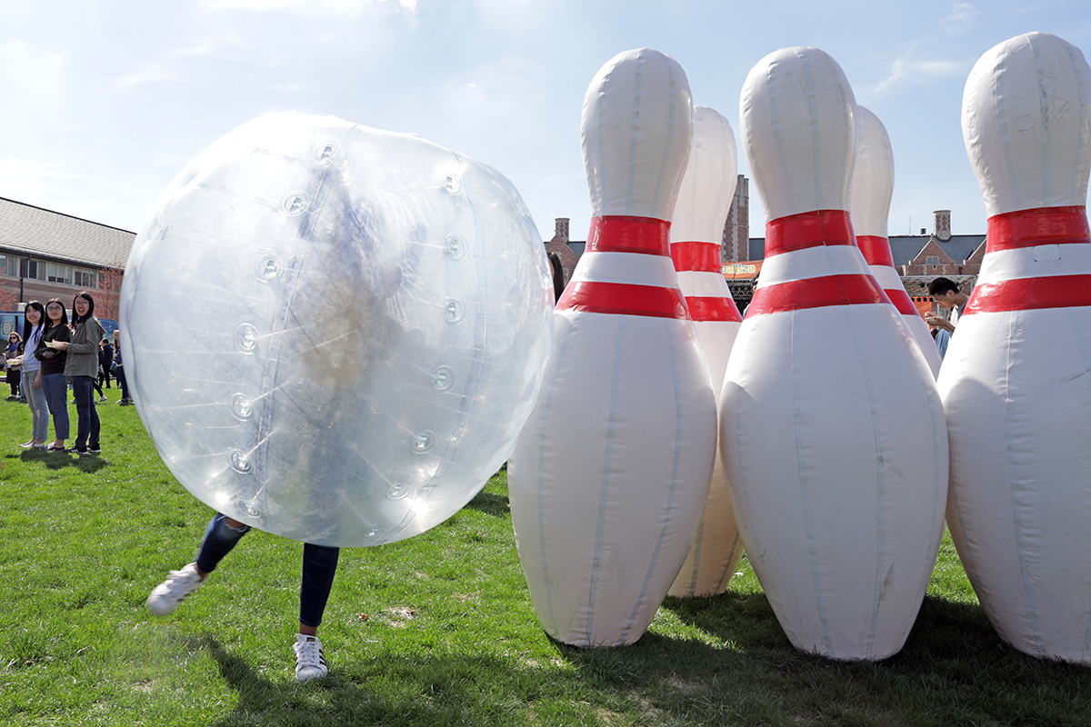 A reveler enjoys human bowling with inflatable pins during Wrightonpalooza April 8. (Photo: James Byard/Washington University)