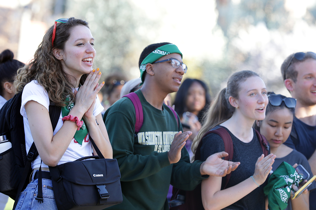 Students cheer during the Wrightonpalooza event April 8 on Mudd Field, held to celebrate Mark and Risa Wrightons’ legacy. (Photo: James Byard/Washington University)
