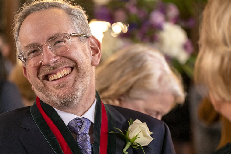 William B. Tolman was installed as the William Greenleaf Eliot Professor of Chemistry in a ceremony led by Chancellor Mark Wrighton and Barbara Schaal, dean of the faculty of Arts & Sciences, March 25 in Holmes Lounge. A gift by Wayman Crow, a co-founder of the university, established the professorship in 1856. (Photo: Sid Hastings/Washington University)
