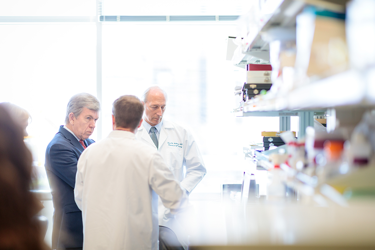 U.S. Sen Roy Blunt (left) talks with David Holtzman, MD, during a visit to the Medical Campus April 12 to talk with scientists about research into Alzheimer’s disease. Blunt is chairman of the Appropriations Subcommittee on Labor, Health and Human Services and has been a key supporter of funding research through the National Institutes of Health (NIH).(Photo: Matt Miller/School of Medicine)