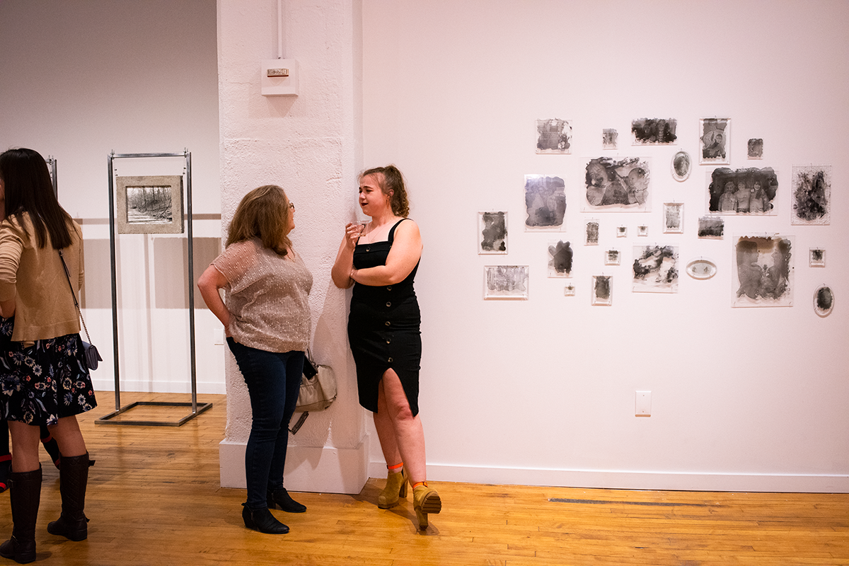 Mary Lynn Zajdel (left) talks with her daughter Grace, a Sam Fox School student, next to the installation “Sisters,” by fellow student Allison Hamburg, showcased as part of the BFA Show on April 12 at the Des Lee Gallery. (Photo: Carol Green/Washington University)