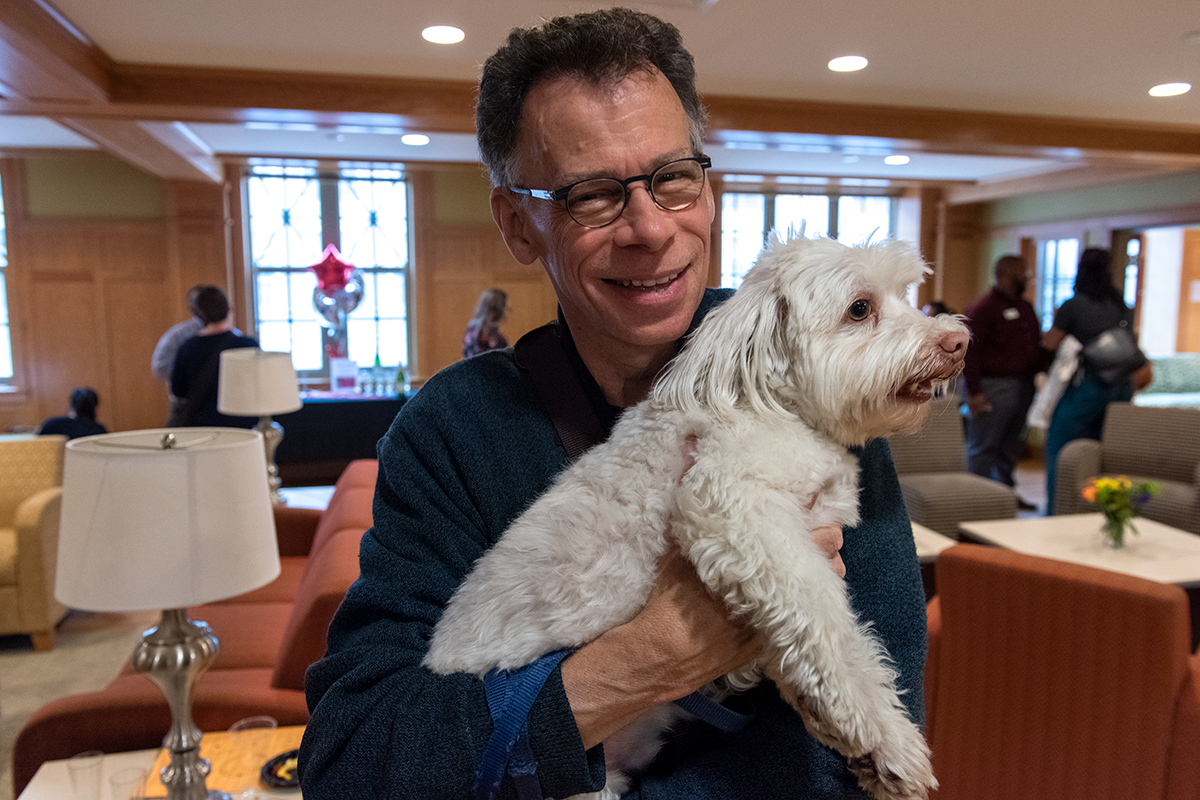 Students, staff and faculty — including former William Greenleaf Eliot fellow Jeffery Matthews, professor in Arts & Sciences, with his dog, Sherman — gathered April 11 in Umrath House for a reception to mark the 20th anniversary of the Faculty Fellows Program on the South 40. (Photo: Sid Hastings/Washington University)