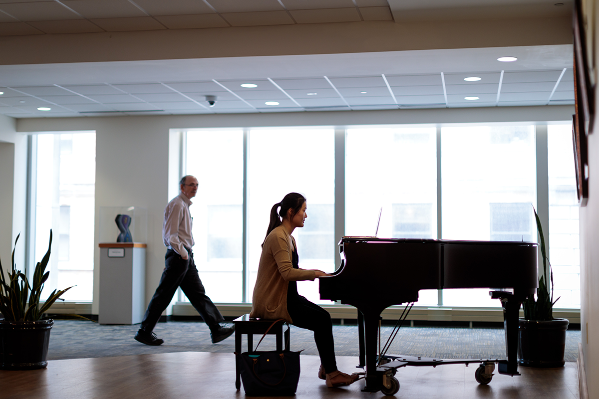Medical student Rebecca Chen plays piano in the lounge at the Farrell Learning and Teaching Center April 11. (Photo: Matt Miller/School of Medicine)