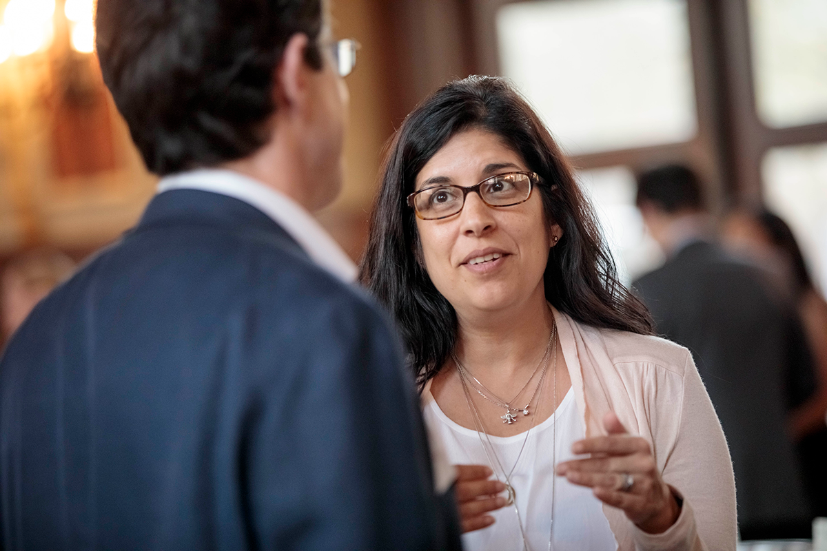 Jennifer Silva, MD, was on hand at the Skandy Awards, held April 10 in Holmes Lounge, to accept an award in innovation. Phillip Cuculich, MD, also was honored in the innovation category. Both are associate professors at the School of Medicine. (Photo: Whitney Curtis/Washington University)