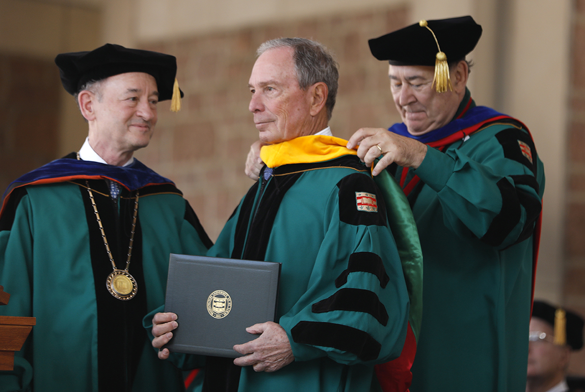 “We face a lot of hard challenges in America today — from climate change to gun violence, to failing schools to the opioid epidemic, and on campuses, from the frightening trend toward racism, sexism, hatred, anti-Semitism and intolerance of unpopular views and opinions,” Bloomberg said at the university’s 158th Commencement on May 17 in Brookings Quadrangle.