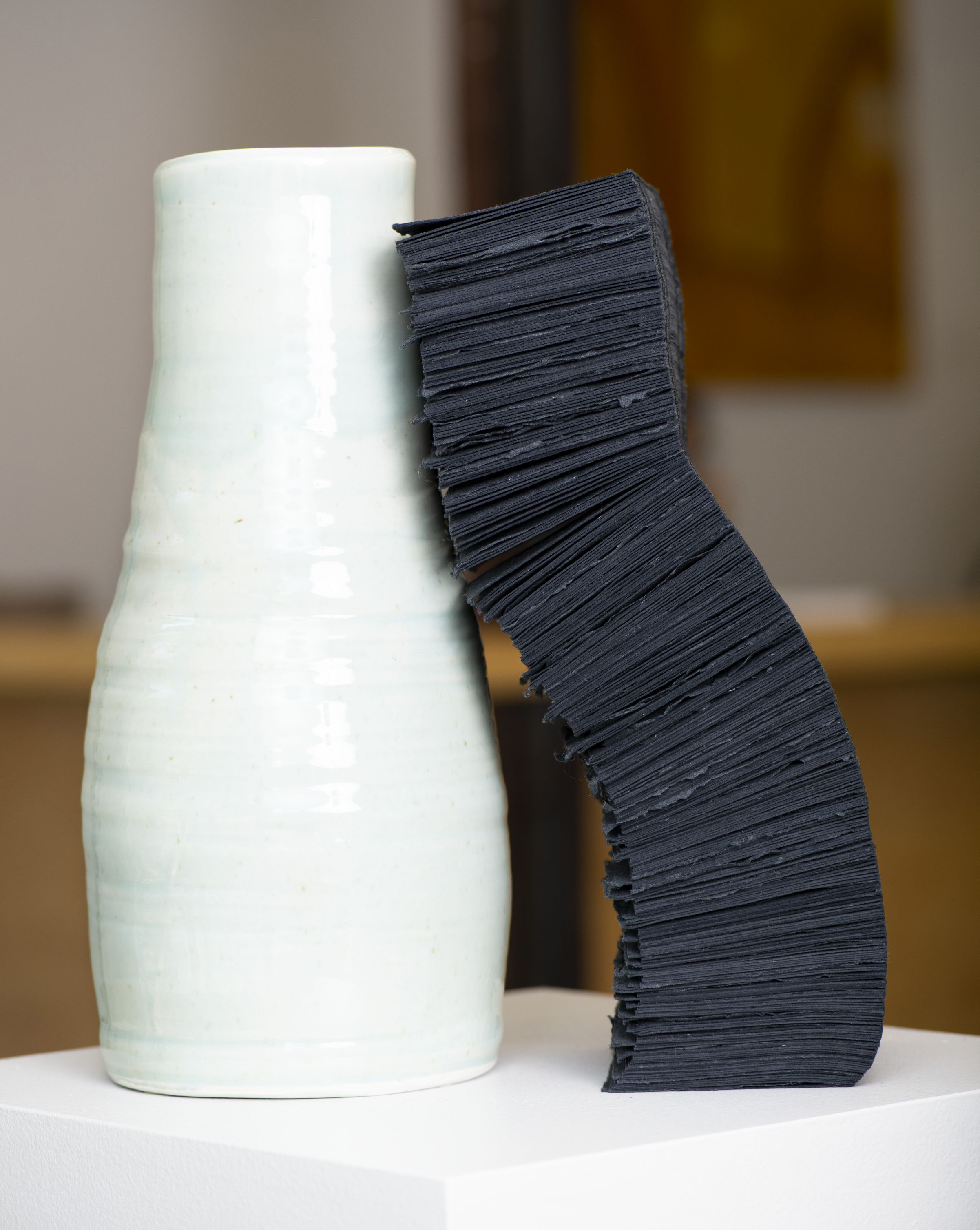 Lara Head, “Two vessels,” 2019. Porcelain, Khadi black rag paper and waxed linen thread.