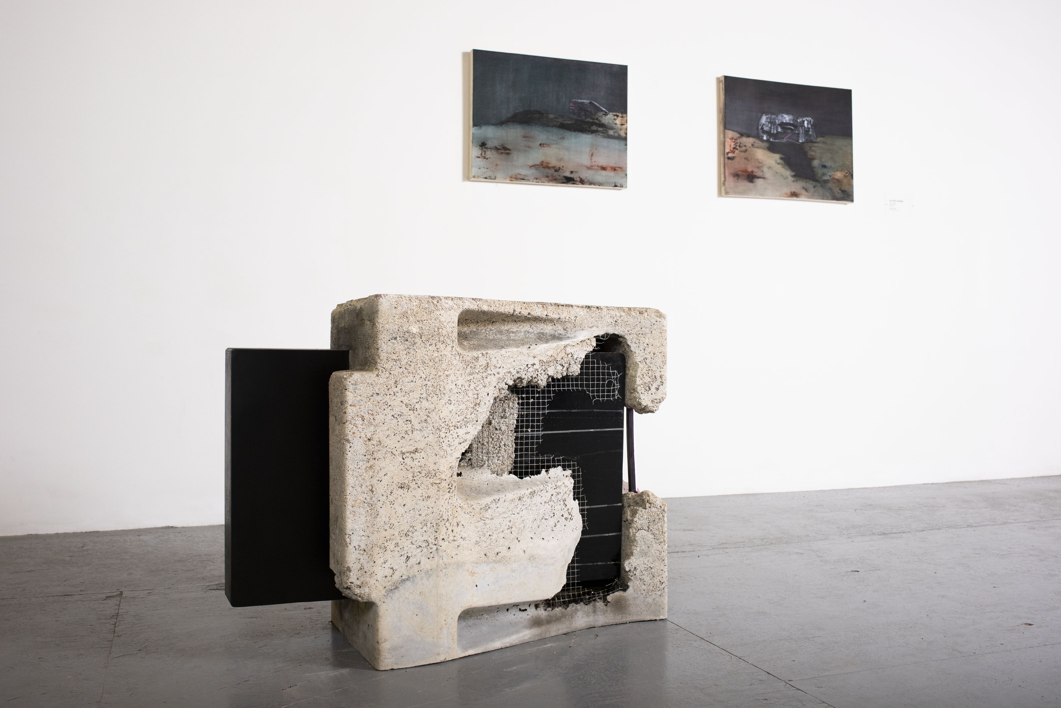 Three works by Sara Ghazi Asadollahi. From left: “Silence,” cement, Plexiglas and LED light; and “Crevice” and “Niche,” both oil on canvas, all 2019.