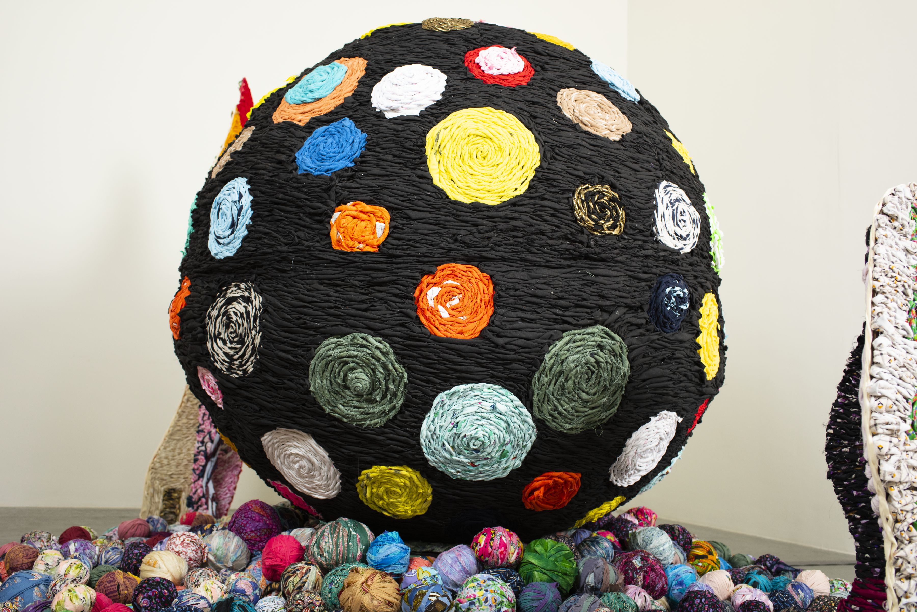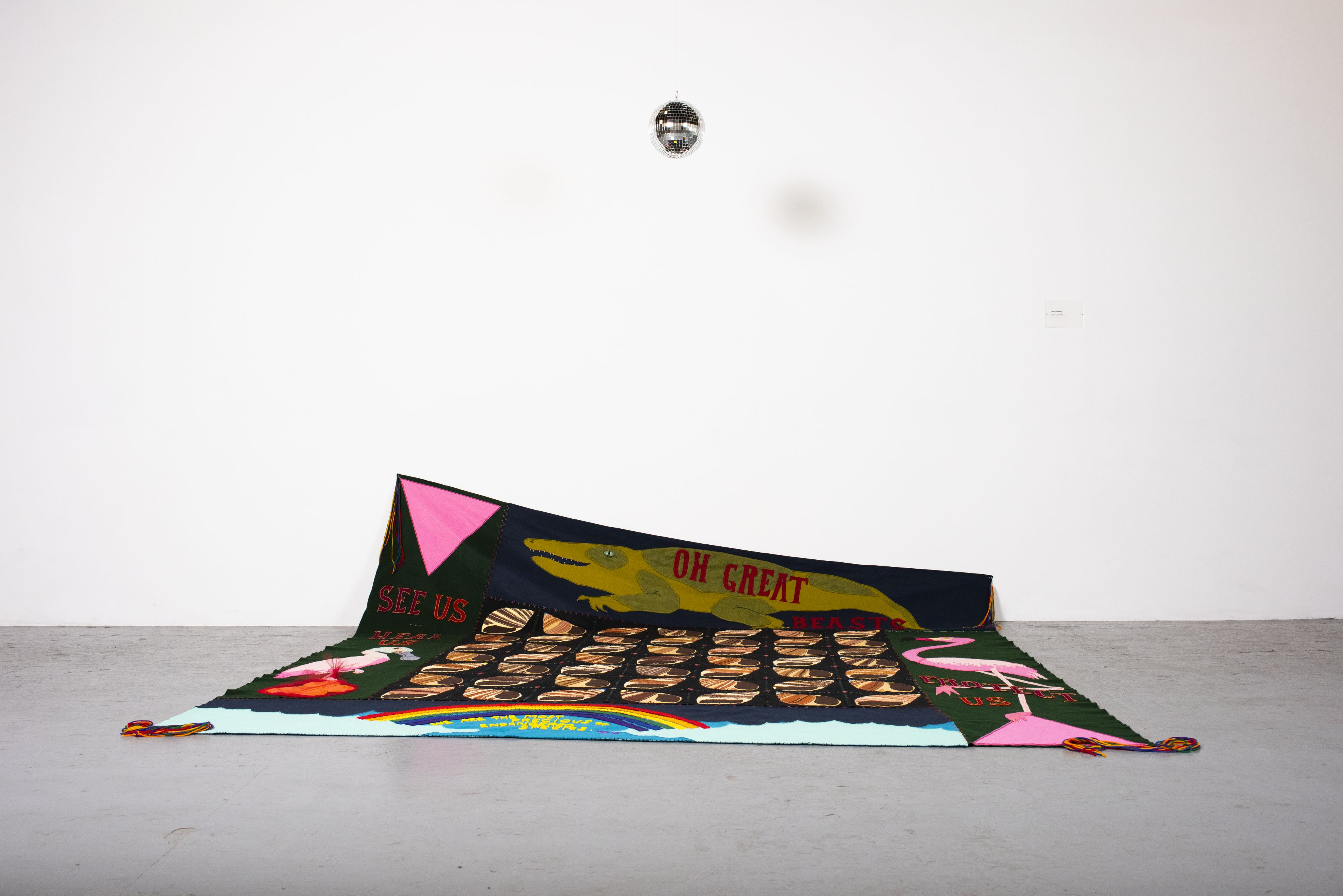 Janie Stamm, “June 12, 2016,” 2019. Felt, thread, glass beads, yarn and disco ball.