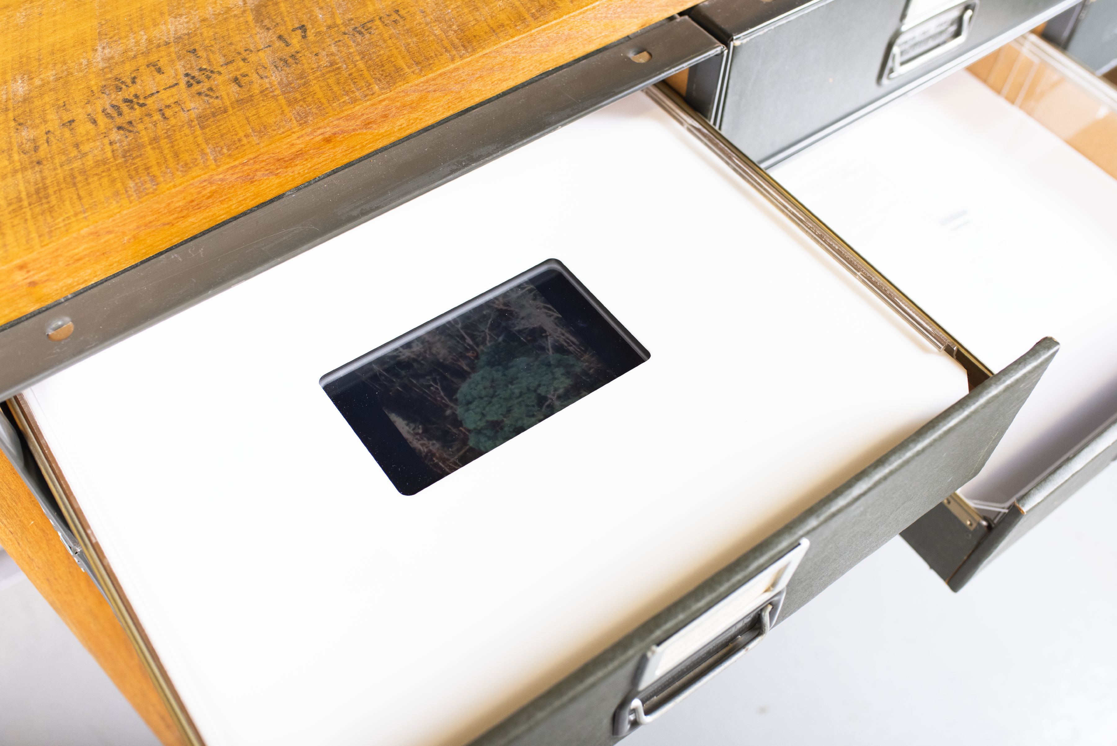 Kevin McCoy, detail from “He that increases knowledge increases sorrow,” 2019. Foil, vintage cardboard file boxes, Plexiglas, World War II-era poplar wood, fabric and thread.
