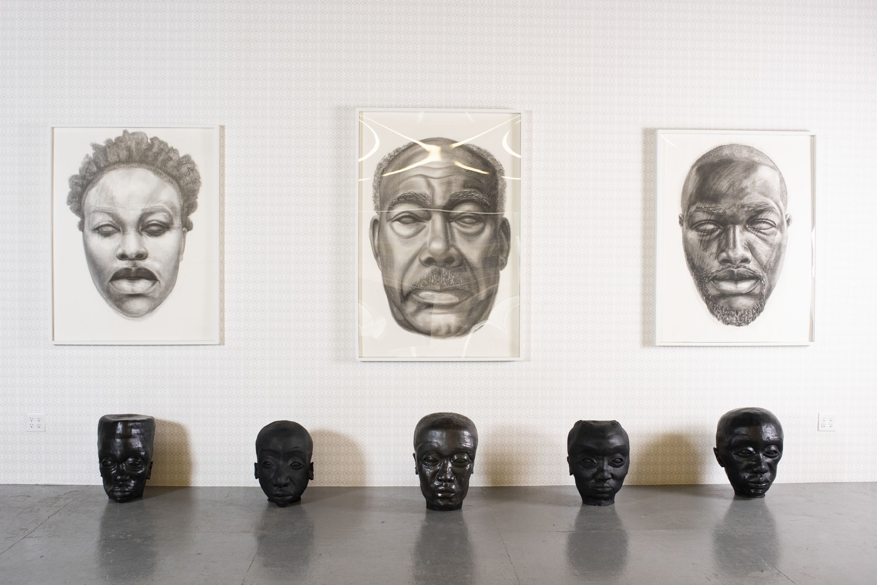 Greg Bailey, eight works from the “Future Relics” series. On wall: “Future Relics: Monument 4,” “Future Relics: Monument 8” and “Future Relics: Monument 5”; charcoal on paper. On floor: “”Future Relics: 2,” “Future Relics: 1,” “Future Relics: 4” “Future Relics: 5” and “Future Relics: 3”; glazed earthenware, all 2019.