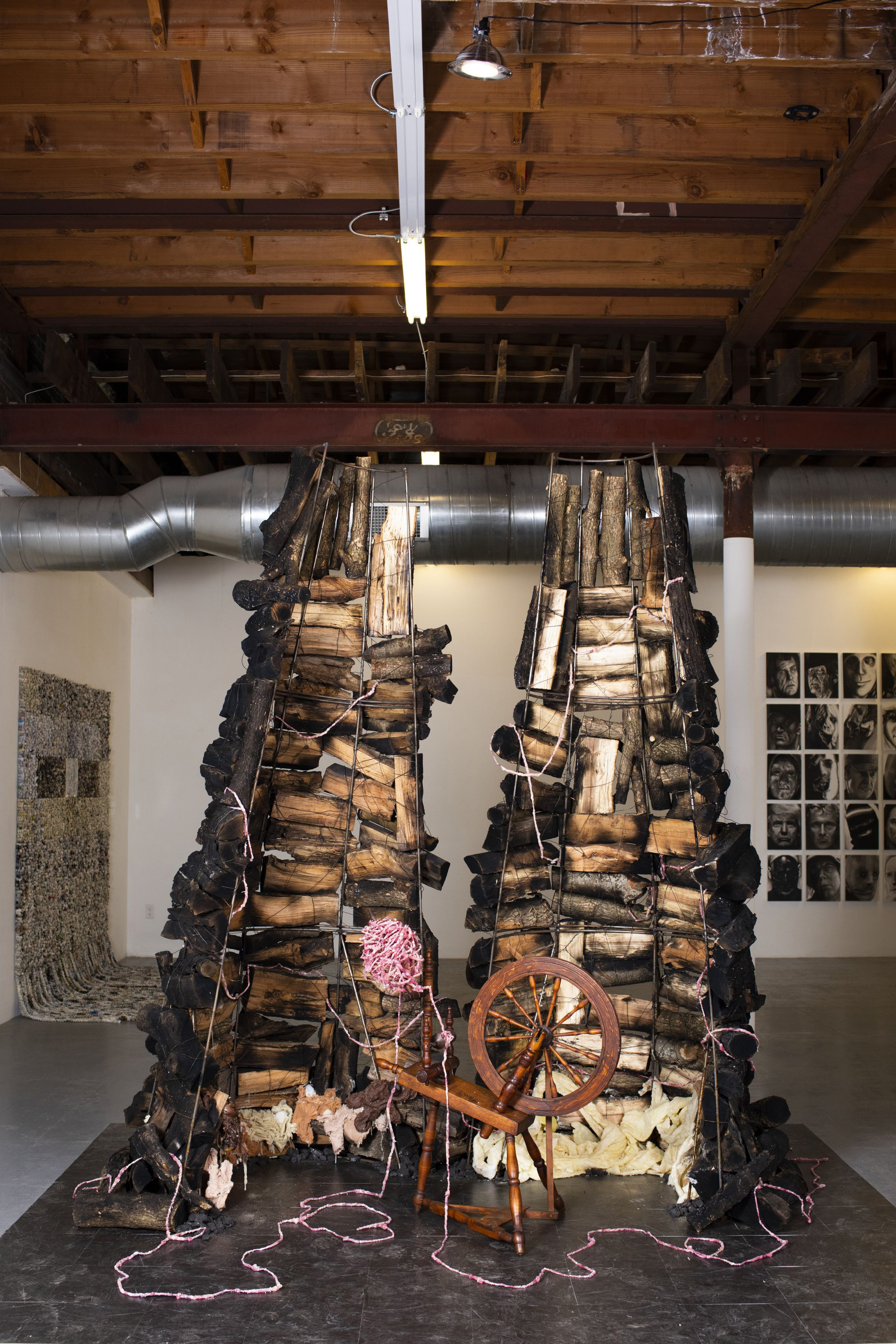Sara Adcock, “Children Shouldn’t Play With Dead Things,” 2019. Wax, wood, coal, steel, yarn and spinning wheel.