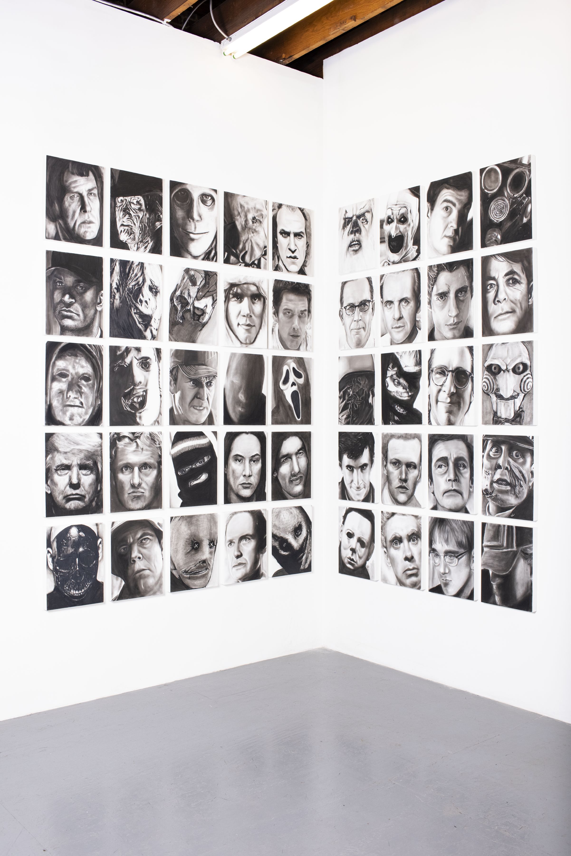 Paula Stevenson, “The Psychos,” 2019. Charcoal and graphite on 45 panels.
