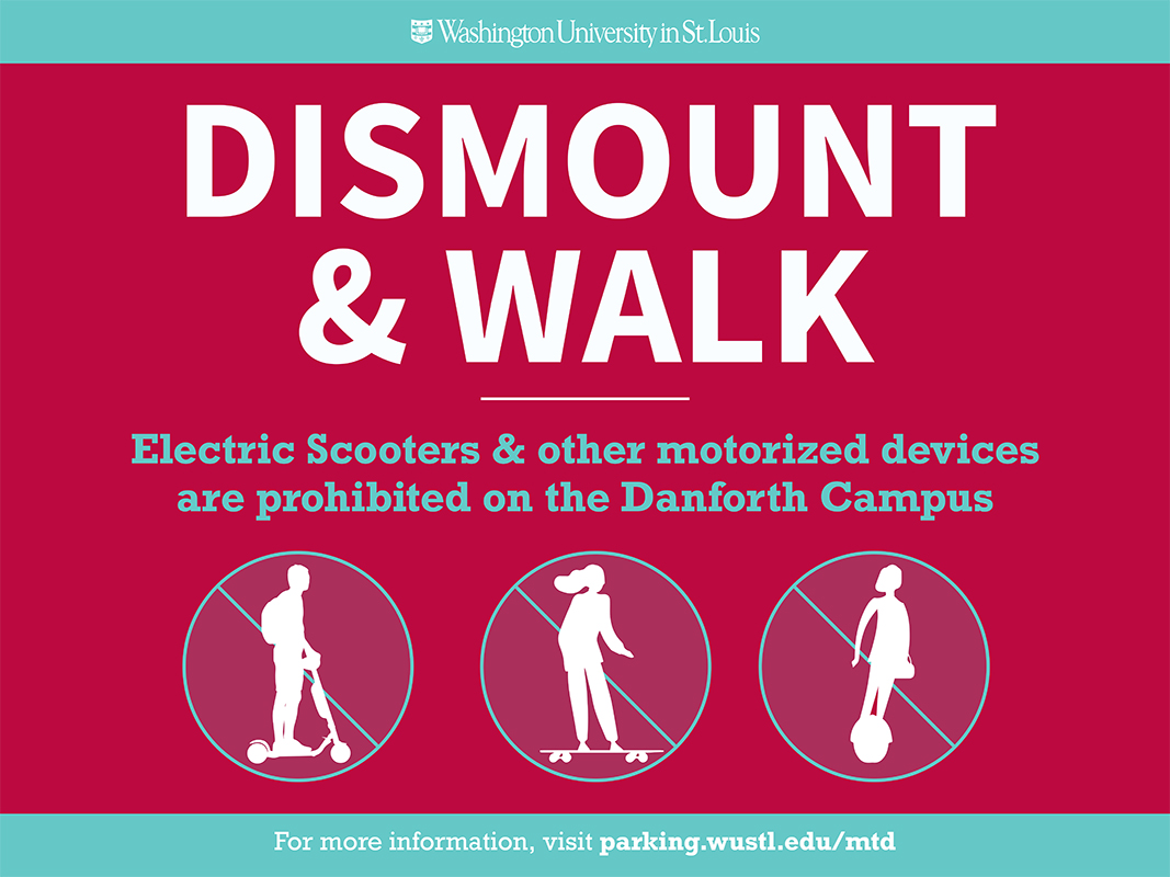 In an effort to support the safety of the Washington University in St. Louis community, electric scooters, motorized skateboards, hoverboards and other motorized transportation devices will no longer be permitted on Danforth Campus sidewalks and pathways as well as on Wrighton Way and Hoyt Drive.