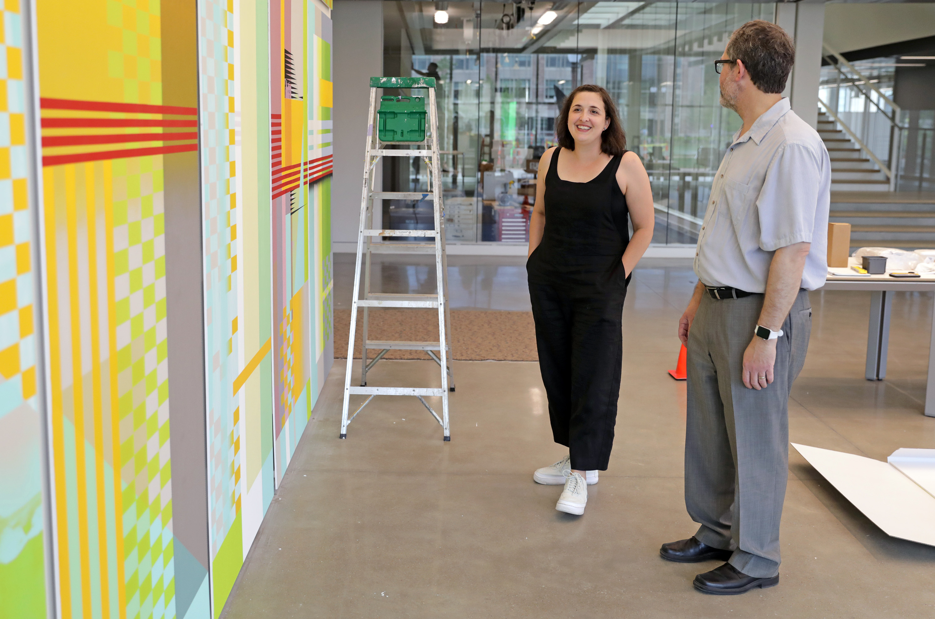 “Glass is such an important element in this building,” Schaefer said. She points out that the mural’s spacing and proportions were inspired by a nearby bank of windows. “Whenever I work on a large installation, I’m very interested in the cues that the building gives me. What are the dynamics of the space? How will viewers approach the piece? The grid of the glass became my structural point-of-departure.”