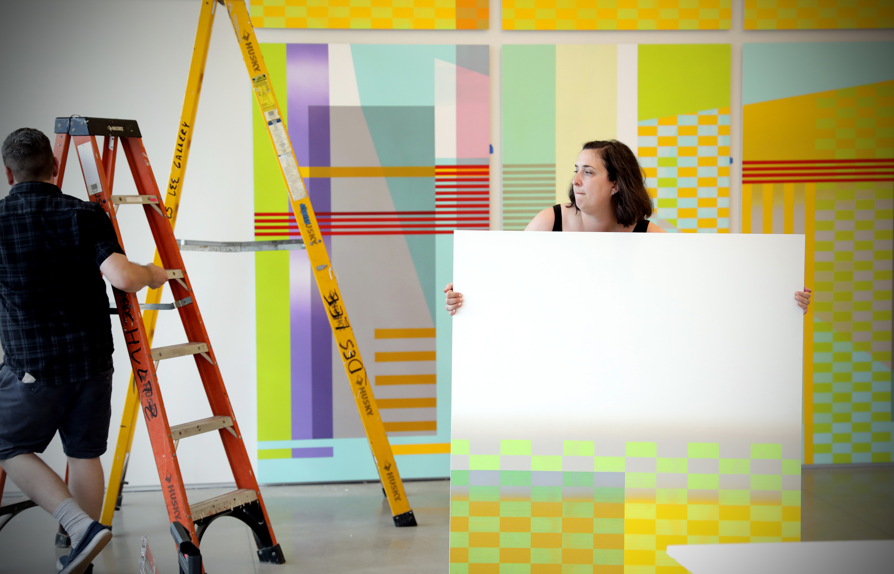 Jon Young (MFA ’18) helps install “it comes and it goes” (2019), a new mural by Anne Schaefer (BFA ’01), as the inaugural Weil Project Wall. (All photos: James Byard/Washington University)
