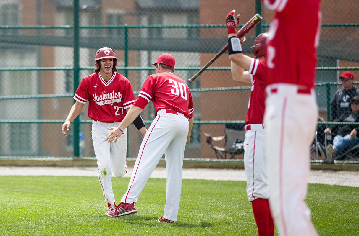Auggie Mense high-fives his teammate after scoring a run in a game against Case Western Reserve University in April 2018. “There is something really special about the way the players support one another. The sense of communities on these teams is amazing.”